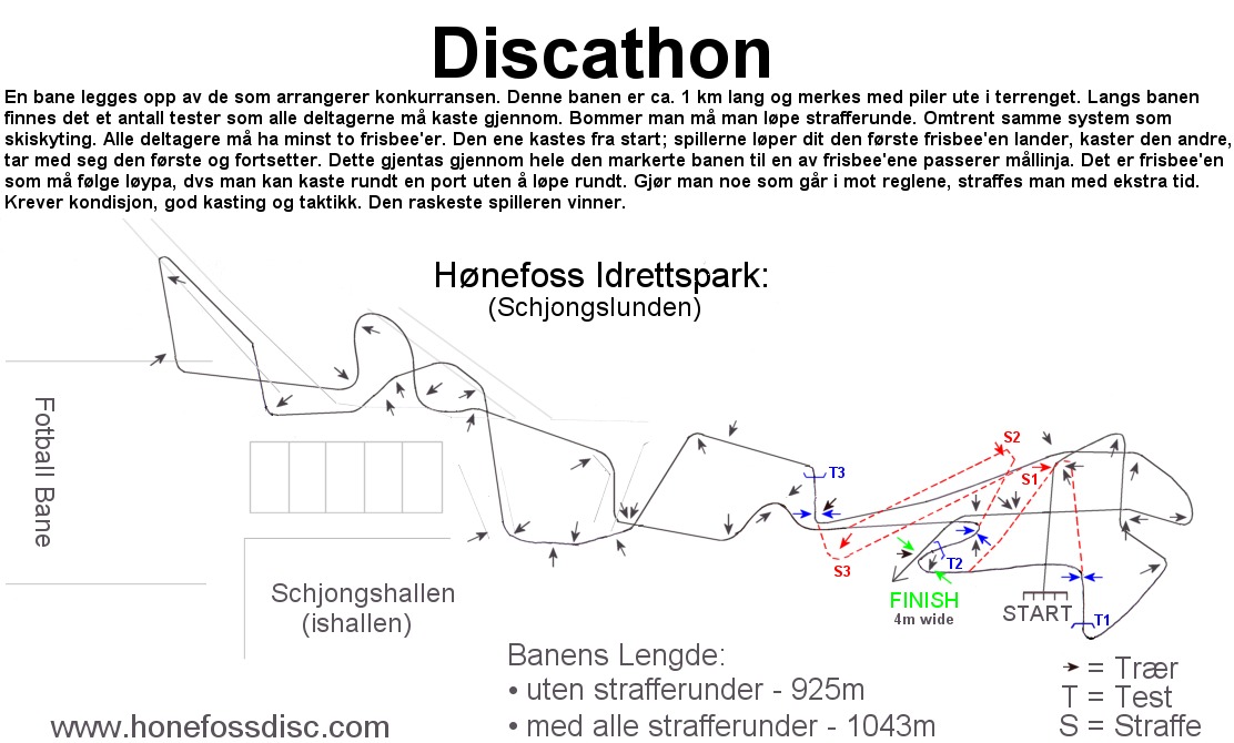 | En bane legges opp av de som arrangerer konkurransen. Denne banen er ca. 1 km lang og merkes med piler ute i terrenget. Langs banen finnes det et antall tester som alle deltagerne må kaste gjennom. Bommer man må man løpe strafferunde. Omtrent samme system som skiskyting. Alle deltagere må ha minst to disker. Den ene kastes fra start; spillerne løper dit den første disken lander, kaster den andre, tar med seg den første og fortsetter. Dette gjentas gjennom hele den markerte banen til en av diskene passerer mållinja. Det er disken som må følge løypa, dvs man kan kaste rundt en port uten å løpe rundt. Gjør man noe som går i mot reglene straffes man med ekstra tid. Krever kondisjon, god kasting og taktikk. Den raskeste spilleren vinner. | ||