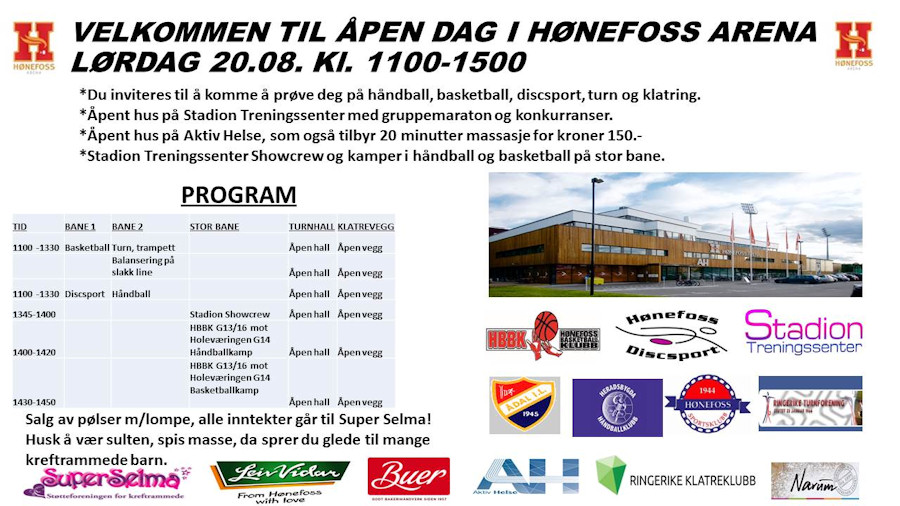 | Aktivitetsplan - lokale skoler 2016 12. mai - VEIEN skole - 6. klasse 11.00 - 13.45 25. mai - HØNEFOSS skole - 6. klasse 08.30 - 10.45 26. mai - ULLERÅL skole - 6. klasse 09.45 - 12.15 01. juni - EIKLI - idrettsdag 4.-7. klasser fra 09.00 - 12.00 02. juni - HEDALEN skole - 5, 6, 7, og 10. klasser 12.25 - 14.40 08. juni - HAUGSBYGD u-skole - 9. klasse 8.30 - 14.00 09. juni - HAUGSBYGD u-skole - 8. klasse 8.20 - 14.00 15. juni - HAUGSBYGD u-skole - 10. klasse 8.30 - 14.00 16. juni - HØNEFOSS skole - idrettsdag 20. juni - HELGERUD - 6. klasse fra 10.00 30. aug - HOLE u-skole - 8. klasse 12.30 - 14.20 01. sept - HOLE u-skole - 9. klasse 08.45 - 10.30 05. sept - HOLE u-skole - 10. klasse 09.25 - 10.55 13. sept - HØNEFOSS skole - 7. klasse 09.30 - 11.00 28. sept - SKOLECUP - Hønefoss Idrettspark 09.30-12.45 |