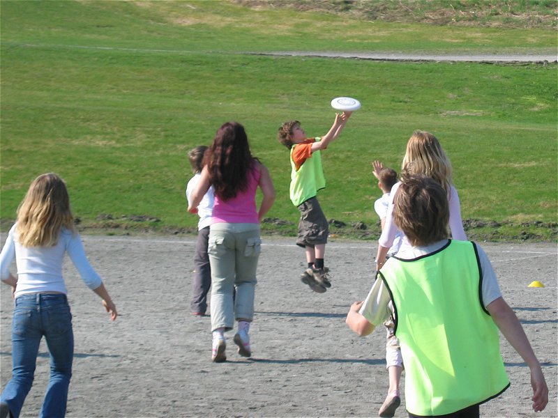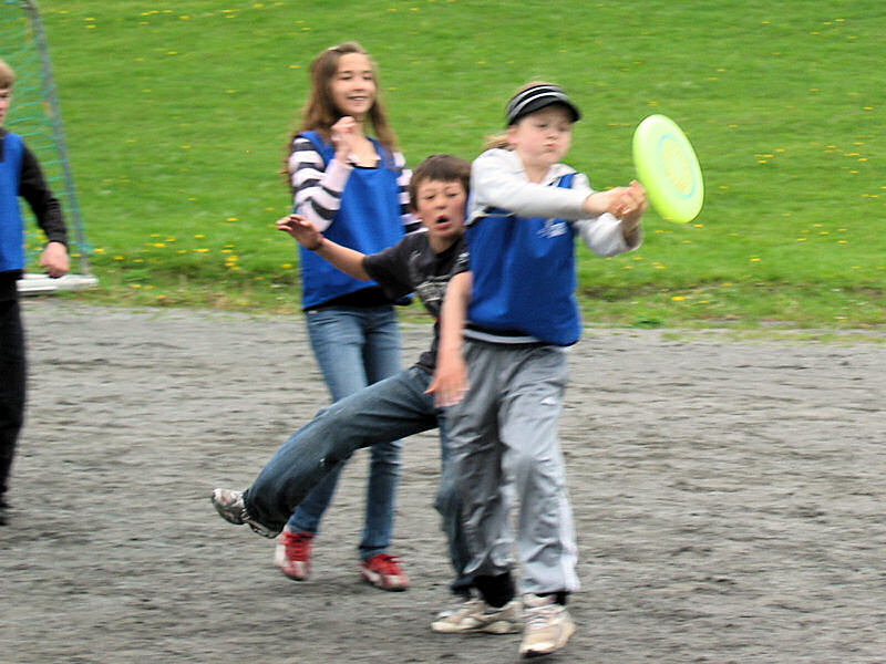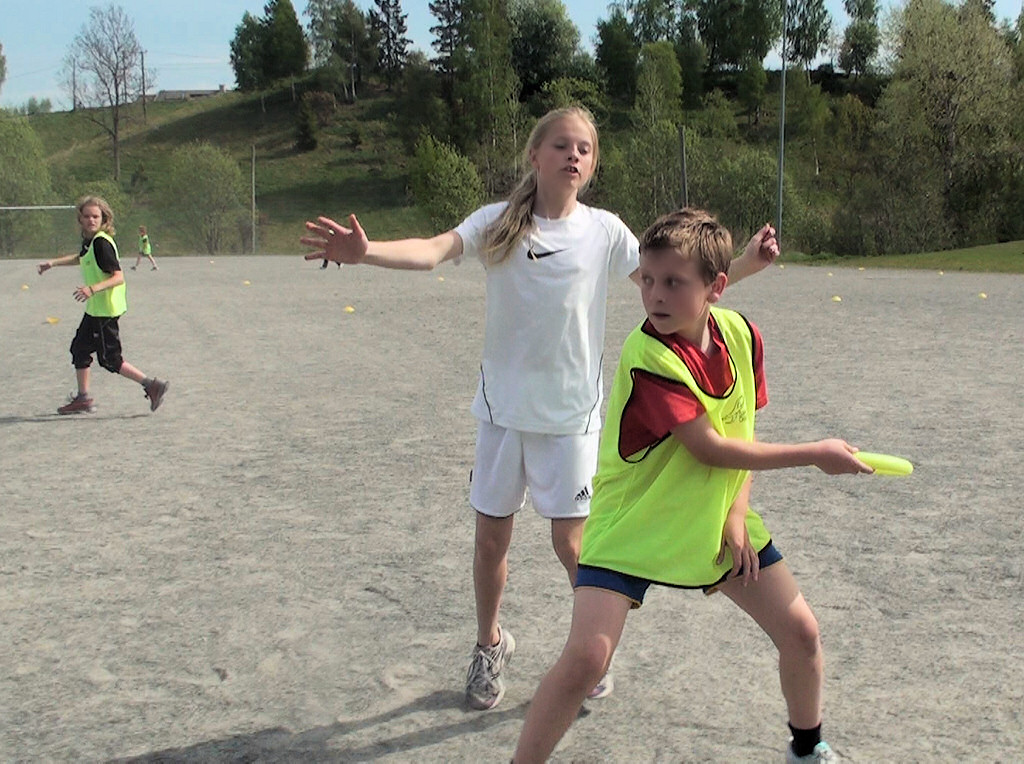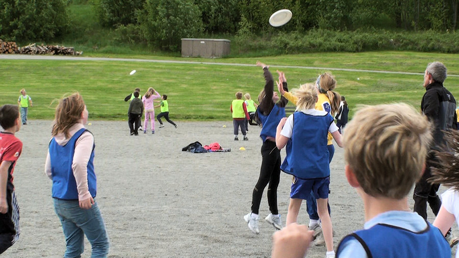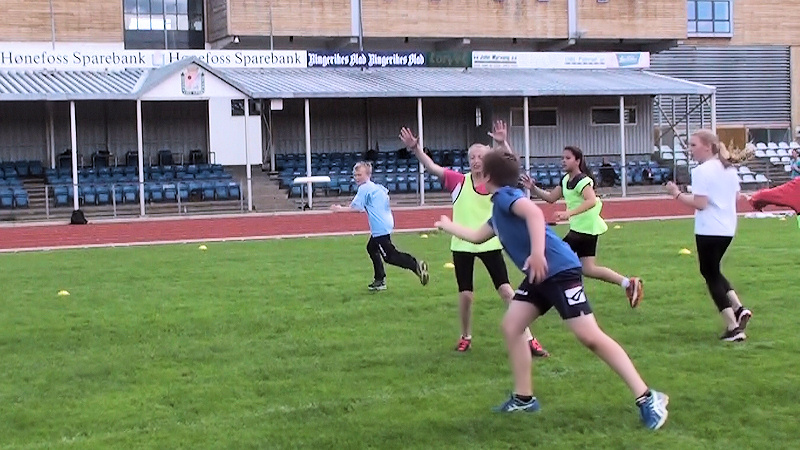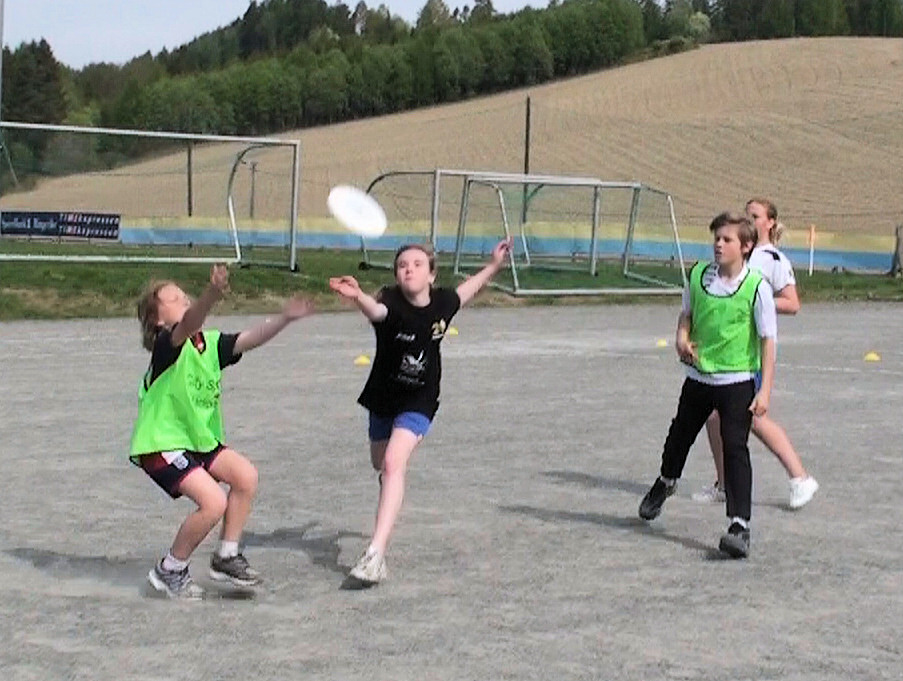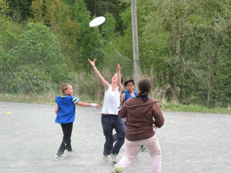 Fredag 14. september var det mye aktivitet i Hønefoss Idrettspark med bl.a. ultimate. 5. 6. og 7. klasse elevene sto på -- som de alltid gjør! Det var ca. 100 barn i idrettsparken. De var delt opp i 8 grupper, og hver gruppe besto av barn fra alle tre klassetrinn. 7. klasse elevene kunne allerede ultimate mens mange av 6. klasse elevene, og alle 5. klasse elevene, fikk sin første introduksjon til ultimate. Etter en forklaring av reglene, og svar på spørsmål, var det full fart på kort tid! Elevene fikk litt tid til kast-og-mottak samtidig som de fikk tips om kasteteknikk. Etter oppvarmingen, ble ultimate reglene forklart og kampene satt i gang. Tips om forsvar og angrep ble gitt under kampene. Nye utfordringer og mye gøy for alle!