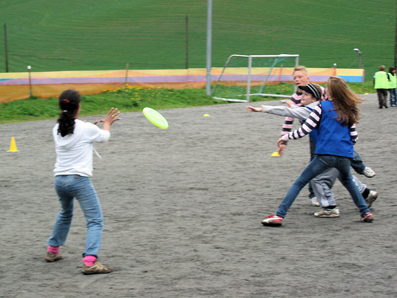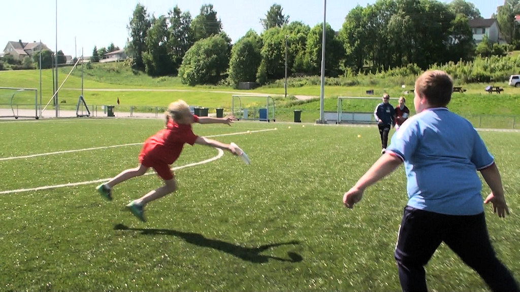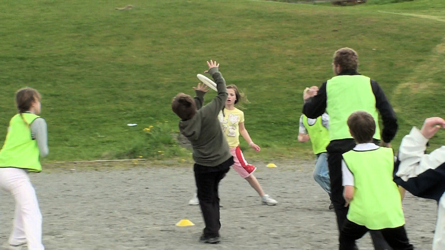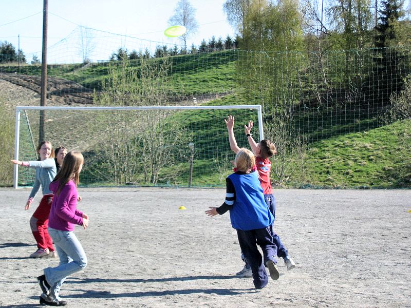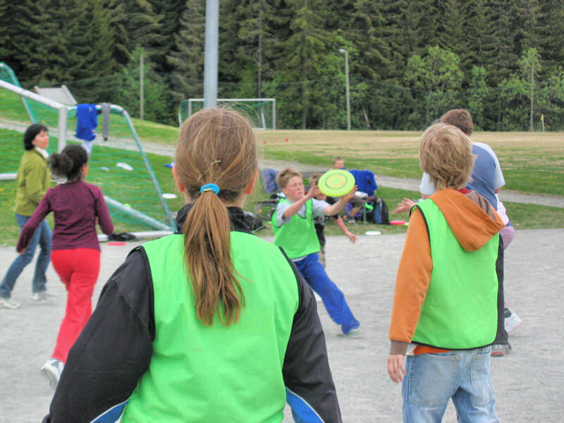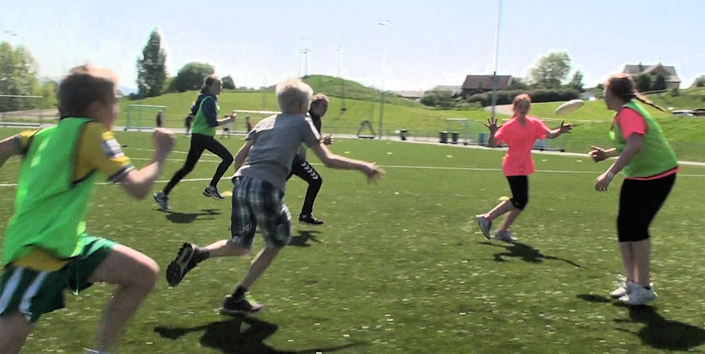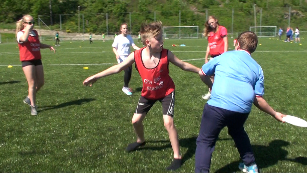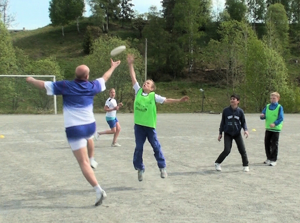 Fredag 14. september var det mye aktivitet i Hønefoss Idrettspark med bl.a. ultimate. 5. 6. og 7. klasse elevene sto på -- som de alltid gjør! Det var ca. 100 barn i idrettsparken. De var delt opp i 8 grupper, og hver gruppe besto av barn fra alle tre klassetrinn. 7. klasse elevene kunne allerede ultimate mens mange av 6. klasse elevene, og alle 5. klasse elevene, fikk sin første introduksjon til ultimate. Etter en forklaring av reglene, og svar på spørsmål, var det full fart på kort tid! Elevene fikk litt tid til kast-og-mottak samtidig som de fikk tips om kasteteknikk. Etter oppvarmingen, ble ultimate reglene forklart og kampene satt i gang. Tips om forsvar og angrep ble gitt under kampene. Nye utfordringer og mye gøy for alle!