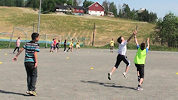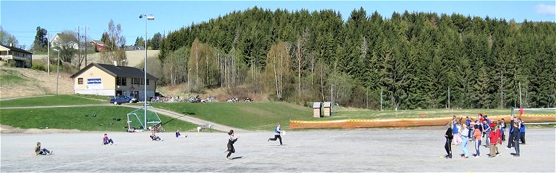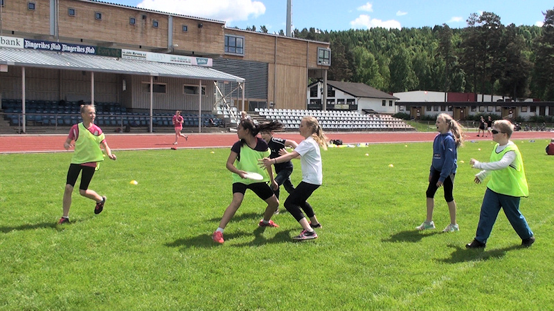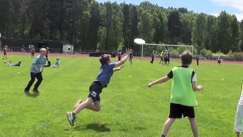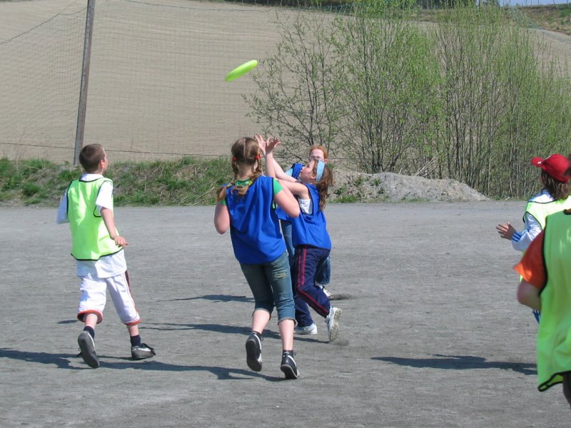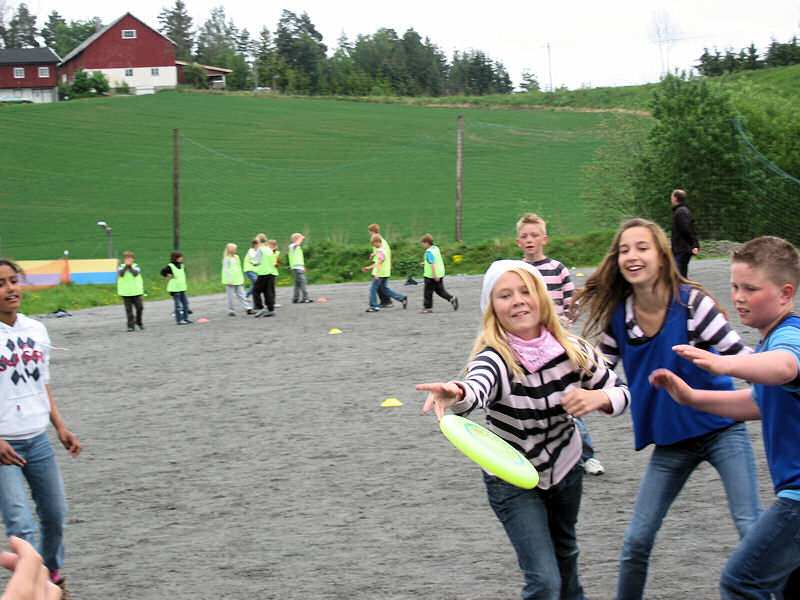 Fredag 23. mai arrangerte Helgerud Skole deres årlige Aktivitetsdag i Hønefoss Idrettspark for 5., 6. og 7. klasse elever. Over 100 barn var i idrettsparken for å være med på diverse aktiviteter, og Hønefoss Discsport Klubb hjalp til med ultimate. Vi spilte på en 50m x 25m ultimatebane, og under spillet var det høyt tempo -- fra start til slutt! Barna var delt opp i 8 grupper, og hver gruppe besto av barn fra alle tre klassetrinn. 7. klasse elevene kunne allerede ultimate mens mange av 6. klasse elevene, og alle 5. klasse elevene, fikk sin første introduksjon til ultimate. Etter en forklaring av reglene, og svar på spørsmål, var det full fart på kort tid!