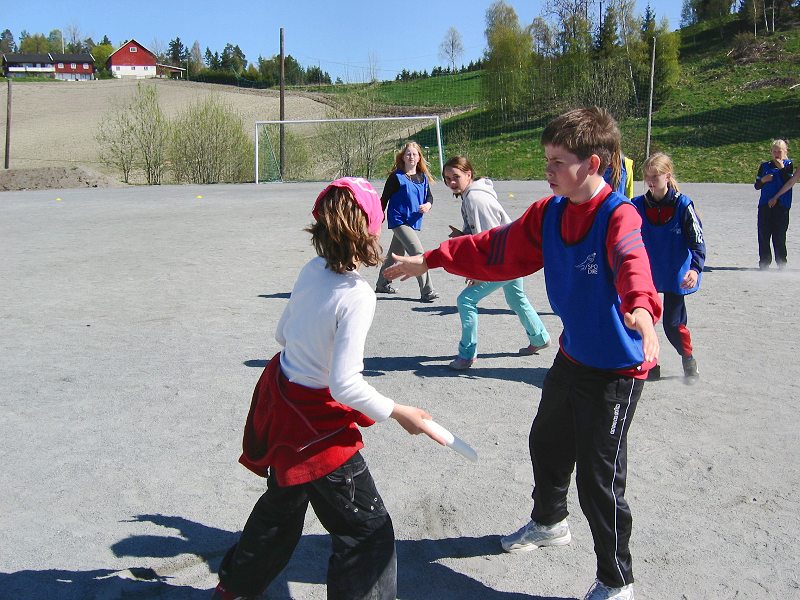 Helgerud skoles 6. trinn var på til Heradsbygda Stadion for å lære om og spille discsport. De fikk med seg nye kunnskaper gjennom 3,5 timer med spill, demonstrasjon og instruksjon. En kort forklaring av de forskjellige discsportene følgt med en freestyle demo ble starten på dagen. Så ble det demo med self-caught flight (SCF) ...og etterpå fikk elevene være med på dette. Vi la grupper á ca. 10 løpe etter de spesielle diskene som flyter lenge i lufta. En morsom og utfordrende måte å lære å lese diskens flyt og fange den før den treffer bakken. Elevene ble vist hvordan å kaste backhand og forehand og hvordan disse benyttes i ultimate. Når det gjelder kast, er riktig grep og snert i håndleddet det viktigste. Med litt veiledning, ble det med en gang stor fremgang for elevene. Fortsatt mye å gå på når det gjelder å bytte grep (backhand-til-forehand-til-backhand osv.) under spillet, men dette kommer med øvelse og erfaring. Alle var flinke og ivrige til å lære så mye de kunne i løpet av den tiden de hadde, og de spilte imponerende. Midt i opplegget spilte vi et stafettløp. Her gjelder det å kaste presis under tidspress. Under den første runden var det lov å kaste kun backhand-kast. Neste runde bare forehand. På siste runden fikk alle lov til å kaste på hvilken som helst måte man ville. Så avsluttet vi med ultimate kamper med siste veilendning før Ultimate Cupen i september.