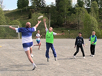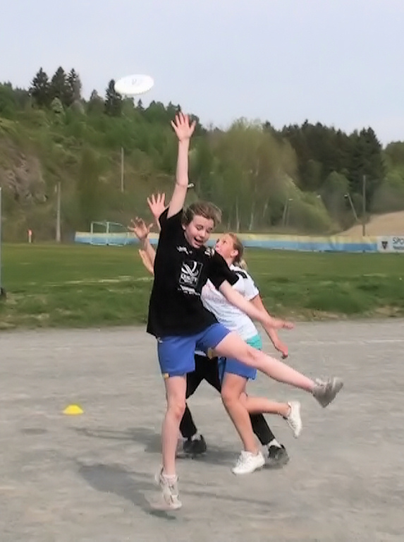 Fredag 24. mai arrangerte Hønefoss Discsport Klubb Ultimate som en del av Helgerud Skoles Aktivitetsdag. Og det viste seg å være kjempeartig for alle! Første gang elevene ved Helgerud Skole fikk spille Ultimate var om høsten 2001 etter at skolen kontaktet klubben. Som den gang, var barna flinke til å lære reglene og spillets gang på kort tid. Vi spilte på en 50m x 25m ultimatebane. Ultimate spilles på en bane som ligner en am.fotballbane. Lagene scorer ved å sentre disken til en medspiller som befinner seg i motstanderens målsone. Under spillet kan man ikke løpe med disken. Man må altså stoppe så fort som mulig etter å ha fanget disken. Man skal da prøve å sentre til en medspiller innen ti sekunder. Man kan pivotere på en fot, og forsvareren har ikke lov til å komme bort i kasteren eller disken (hvis ikke disken er i luften da!). Når et lag mister kontrollen over disken får det andre laget disken, og spillet snur med en gang. Et lag mister kontrollen ved at disken enten går i bakken, utenfor banen, blir slått ned eller fanget av en motstander. Laget som først scorer 21 mål vinner (minimum 2 mål i forskjell mellom lagene, eller først til 25 mål). En kamp kan også spilles til et lavere antall mål, f.eks. til 13. Eller man kan spille etter tid, som i basket. Stor takk til Tor Gunnar Lakselvhaug for hjelpen, og ikke minst til alle av dagens mange Ultimate spillere.