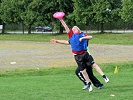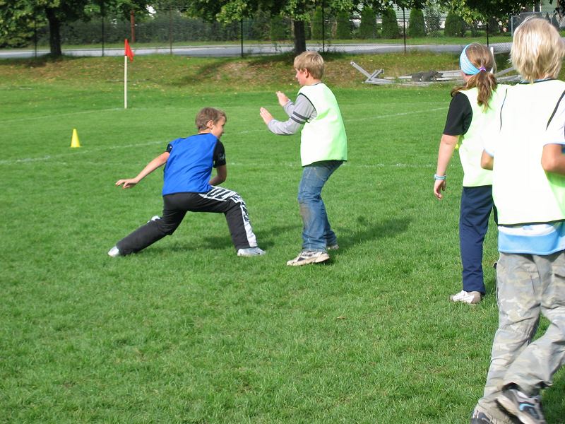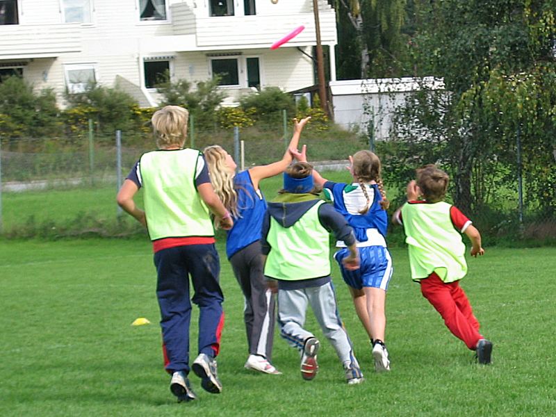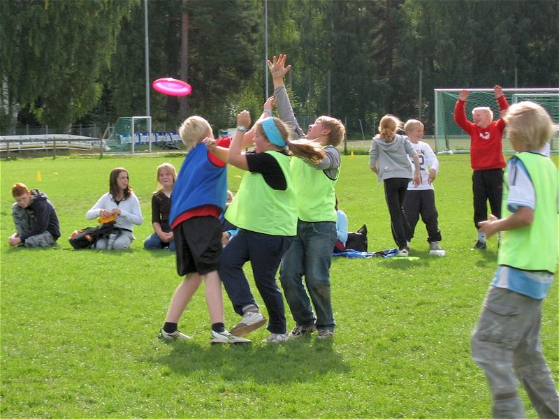 I årets cup kom begge skolene til idrettsparken med 3 lag hver, og begge skolene fikk hver sin bane (pulje) hvor sine lag spilte 2 kamper hver. Puljevinnerne representerte sine skoler i finalen. En tredje bane ble brukt til treningskamper mens turneringskampene pågikk. Barna har spilt ultimate i skolen siden 5. klassen og spilte med stor iver i cupen. Under treningskampene fikk de tips og veiledning som kunne settes ut i livet i turneringskampene, i både forsvar- og angrepspillet. Spesielt nyttig var tips om å ta tiden til hjelp og ikke forhaste seg med å bli kvitt disken. Noen av lagene fikk en så bra forståelse av posisjonene at de delte ut posisjoner (foran, bak) til sine spillere og la "handlerne" (som spiller bak) ta opp disken på avkast og turnovers. Meget nyttig. Og det så vi! Finalen ble en spennende kamp med mye bra forsvarspill fra begge skolene, men det var Helgerud som hadde overtaket i angrep og vant tilslutt 7-2. |