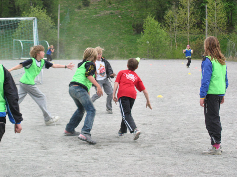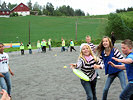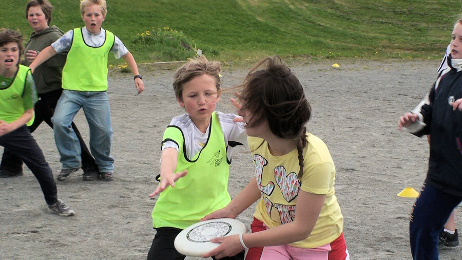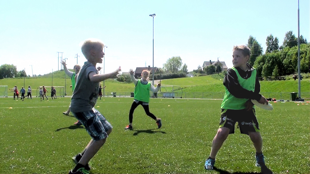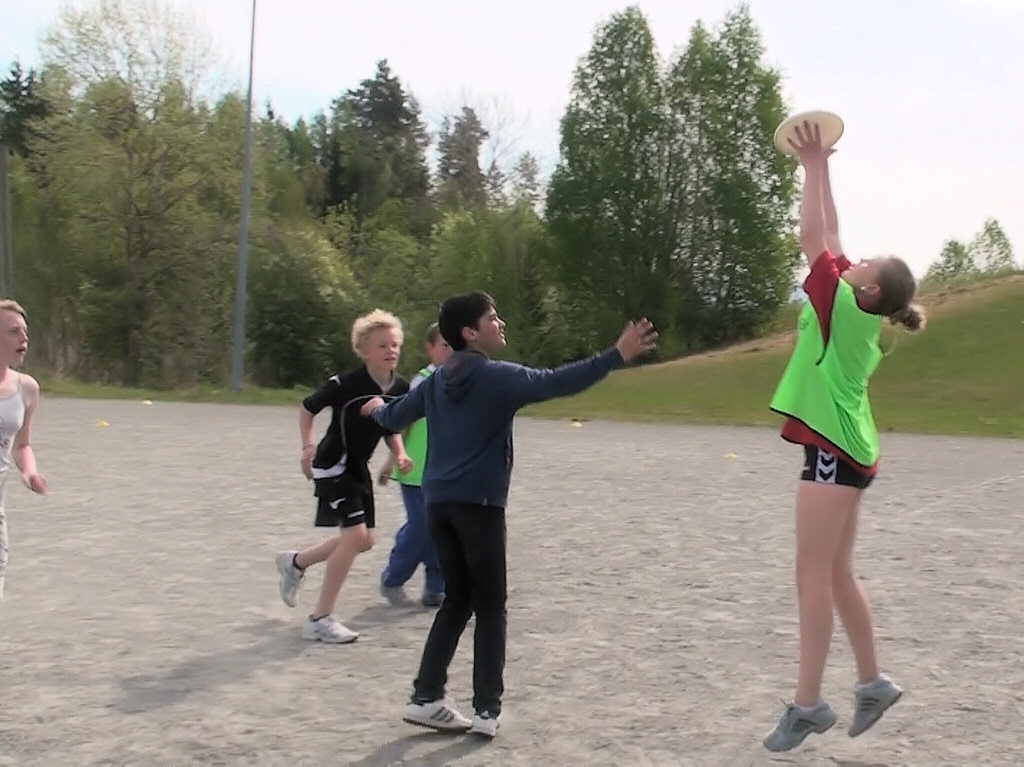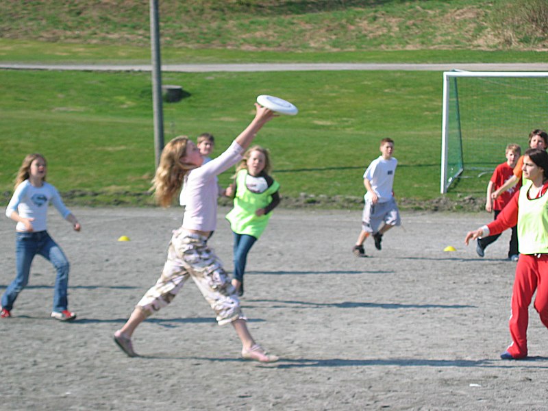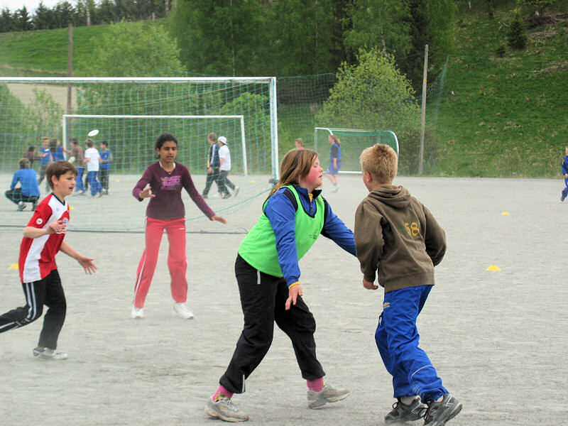 Fredag 14. september var det mye aktivitet i Hønefoss Idrettspark med bl.a. ultimate. 5. 6. og 7. klasse elevene sto på -- som de alltid gjør! Det var ca. 100 barn i idrettsparken. De var delt opp i 8 grupper, og hver gruppe besto av barn fra alle tre klassetrinn. 7. klasse elevene kunne allerede ultimate mens mange av 6. klasse elevene, og alle 5. klasse elevene, fikk sin første introduksjon til ultimate. Etter en forklaring av reglene, og svar på spørsmål, var det full fart på kort tid! Elevene fikk litt tid til kast-og-mottak samtidig som de fikk tips om kasteteknikk. Etter oppvarmingen, ble ultimate reglene forklart og kampene satt i gang. Tips om forsvar og angrep ble gitt under kampene. Nye utfordringer og mye gøy for alle!