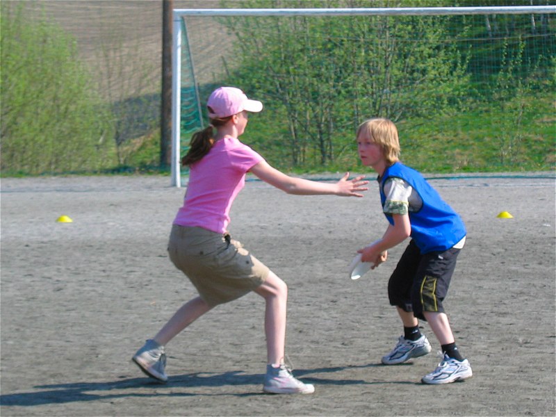 Fredag 24. mai arrangerte Hønefoss Discsport Klubb Ultimate som en del av Helgerud Skoles Aktivitetsdag. Og det viste seg å være kjempeartig for alle! Første gang elevene ved Helgerud Skole fikk spille Ultimate var om høsten 2001 etter at skolen kontaktet klubben. Som den gang, var barna flinke til å lære reglene og spillets gang på kort tid. Vi spilte på en 50m x 25m ultimatebane. Ultimate spilles på en bane som ligner en am.fotballbane. Lagene scorer ved å sentre disken til en medspiller som befinner seg i motstanderens målsone. Under spillet kan man ikke løpe med disken. Man må altså stoppe så fort som mulig etter å ha fanget disken. Man skal da prøve å sentre til en medspiller innen ti sekunder. Man kan pivotere på en fot, og forsvareren har ikke lov til å komme bort i kasteren eller disken (hvis ikke disken er i luften da!). Når et lag mister kontrollen over disken får det andre laget disken, og spillet snur med en gang. Et lag mister kontrollen ved at disken enten går i bakken, utenfor banen, blir slått ned eller fanget av en motstander. Laget som først scorer 21 mål vinner (minimum 2 mål i forskjell mellom lagene, eller først til 25 mål). En kamp kan også spilles til et lavere antall mål, f.eks. til 13. Eller man kan spille etter tid, som i basket. Stor takk til Tor Gunnar Lakselvhaug for hjelpen, og ikke minst til alle av dagens mange Ultimate spillere.