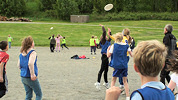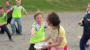 Fredag 17. september arrangerte Helgerud Skole deres årlige Aktivitetsdag i Hønefoss Idrettspark for 5., 6. og 7. klasse elever. Hønefoss Discsport Klubb hjalp til med ultimate, og barna fikk spille på en 50m x 25m ultimatebane. At det blåste og regnet hardt spilte ingen rolle -- det ble høyt tempo fra start til slutt! Vi startet med oppvarming (kast-og-mottak), og samtidig fikk barna tips om kasteteknikk (forehand-kast og backhand-kast) før vi satte i gang med ultimate. 7. og 6. klasse elevene kunne allerede ultimate-reglene fra før mens 5. klasse elevene fikk sin første introduksjon til ultimate. Etter en forklaring av reglene, var det full fart på kort tid! Den aller første gang elever ved Helgerud Skole fikk spille ultimate var om høsten 2001 etter at skolen kontaktet Hønefoss Discsport Klubb. Siden den gang, har det vært mange morsome disk-treff, med både ultimate og andre discsport. Vi ser fram til flere!