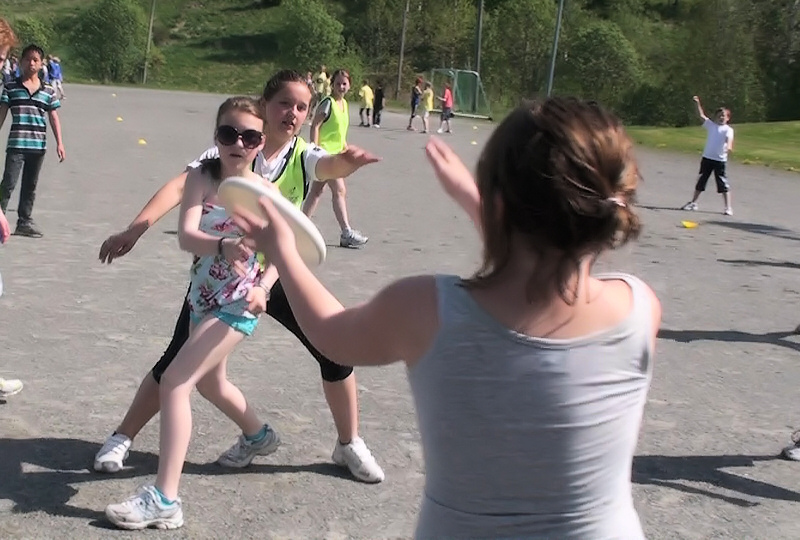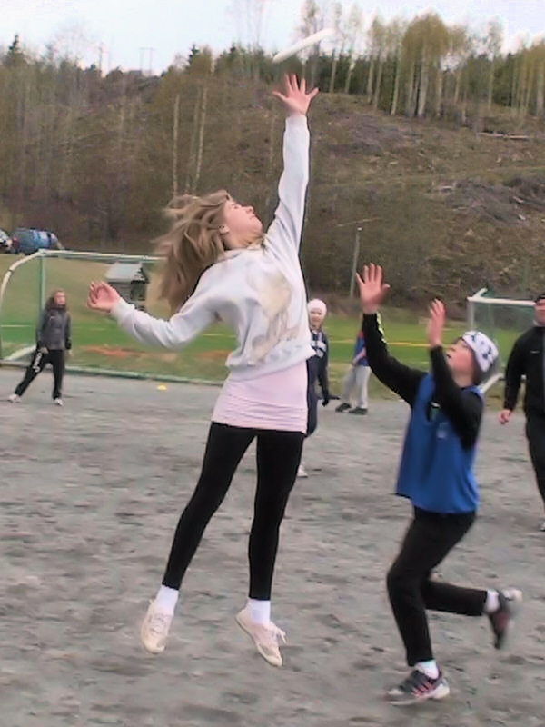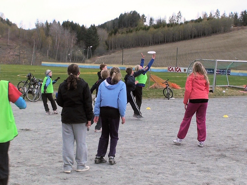 4 kuldegrader og frost i morgentimene var nok til å sette en stopper for det planlagte arrangementet på Heradsbygda Stadion. Men gleden var stor da skolen og discsport klubben arrangerte ultimate noen timer senere på skolegården! Med skolens disker og markører, kunne vi sette i gang ultimate kamper for femti 7. klasse elever. Elevene er så godt kjent med ultimate nå at det eneste å holde styr på er innbytte av spillere. Enkelt å sette inn spillere, men vanskeligere å ta dem ut. Gøy med disker -- helt i slutten av utendørs sesongen!