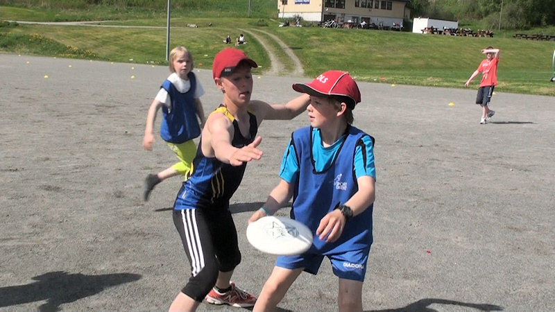 Helgerud skoles 6. trinn var på til Heradsbygda Stadion for å lære om og spille discsport. De fikk med seg nye kunnskaper gjennom 3,5 timer med spill, demonstrasjon og instruksjon. En kort forklaring av de forskjellige discsportene følgt med en freestyle demo ble starten på dagen. Så ble det demo med self-caught flight (SCF) ...og etterpå fikk elevene være med på dette. Vi la grupper á ca. 10 løpe etter de spesielle diskene som flyter lenge i lufta. En morsom og utfordrende måte å lære å lese diskens flyt og fange den før den treffer bakken. Elevene ble vist hvordan å kaste backhand og forehand og hvordan disse benyttes i ultimate. Når det gjelder kast, er riktig grep og snert i håndleddet det viktigste. Med litt veiledning, ble det med en gang stor fremgang for elevene. Fortsatt mye å gå på når det gjelder å bytte grep (backhand-til-forehand-til-backhand osv.) under spillet, men dette kommer med øvelse og erfaring. Alle var flinke og ivrige til å lære så mye de kunne i løpet av den tiden de hadde, og de spilte imponerende. Midt i opplegget spilte vi et stafettløp. Her gjelder det å kaste presis under tidspress. Under den første runden var det lov å kaste kun backhand-kast. Neste runde bare forehand. På siste runden fikk alle lov til å kaste på hvilken som helst måte man ville. Så avsluttet vi med ultimate kamper med siste veilendning før Ultimate Cupen i september.