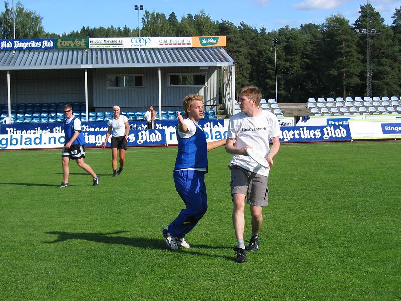 Hønefoss Ultimate Challenge 2005 Steffen Gomnes (Hønefoss) forsvarer Ketil Schyberg (Freebies);Tor-Gunnar Lakselvhaug og Heike Brandt i bakgrunnen.Hønefoss Idrettspark - 3. september 2005